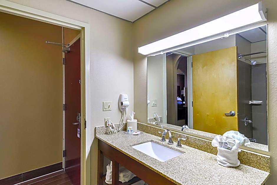 The suite offers air conditioning, a tea and coffee maker, a seating area, as well as a TV with cable channels.